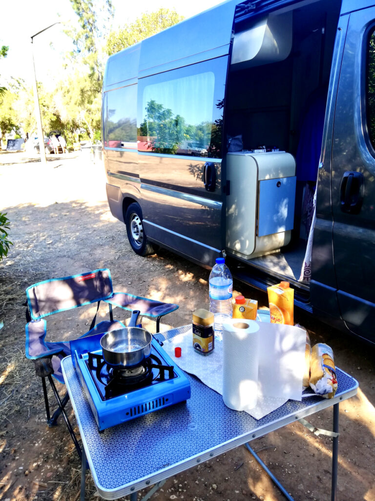 - Normalmente i Van dispongono di un fornello da cucina fisso o portatile. In entrambi i casi si raccomanda di cucinare con il portellone posteriore aperto per evitare che il gas della bombola rimanga all’interno del Van. In caso di forte vento, come spesso succede in Portogallo, si puo’ anche tenere il portellone chiuso, ma si raccomanda di tenere le finestre poste sul soffitto del Van aperte almeno da cambiare l’aria.
