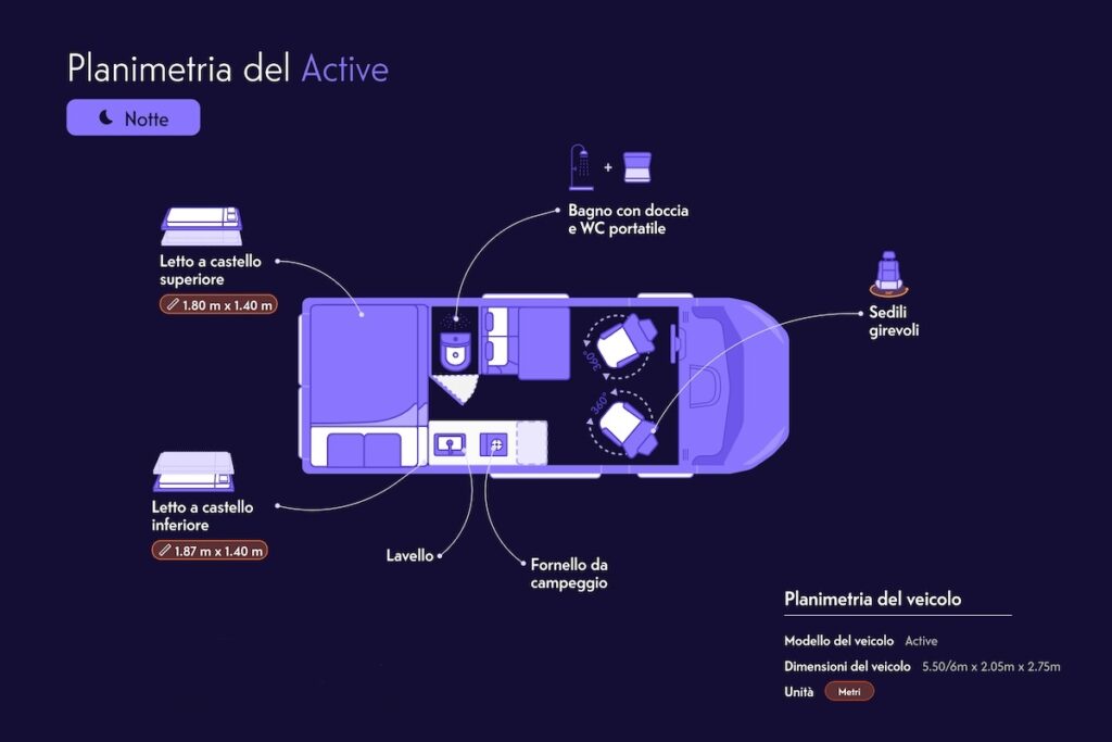 - Se opti per il noleggio con Indie Camper e siete in 2 o 4 persone, il miglior compromesso comodità/ingombro/costo è sicuramente il modello Active (trovi qui sotto la planimetria del Van). Sono presenti due letti a 1 piazza e mezza, uno a livello superiore e l’altro inferiore a livello del tavolo ( che non si puo’ rimuovere). Quando procedi al noleggio sul sito, ti consiglio di inserire tra gli optional anche sedie e tavolino da esterni in modo che, se il tavolo dentro è occupato da valigie o vestiti o semplicemente c’è il letto aperto, puoi mangiare comodamente fuori. Se non vuoi portare in valigia la biancheria da letto ti consiglio di inserire anche questa insieme ai cuscini e coperta tra gli optional. Gli asciugamani invece non sono disponibili. Avrai a disposizione anche un fornelletto da Campeggio con una bombola inclusa (per 1 settimana / 10 giorni dovrebbe essere sufficiente per la colazione e un pasto al giorno).